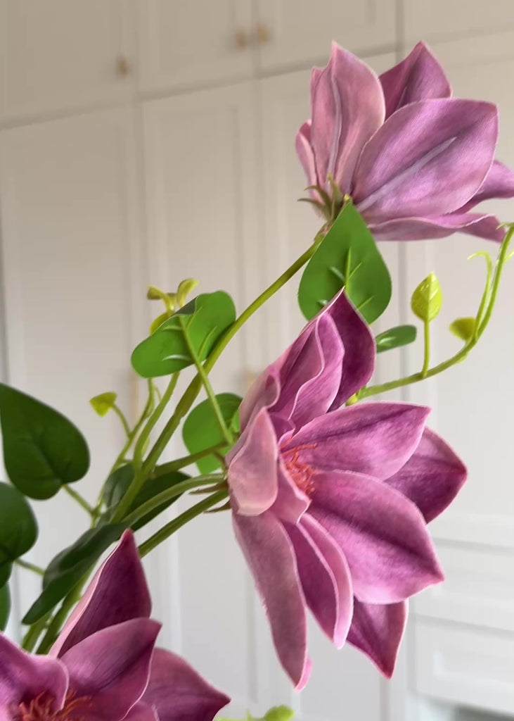 Elegant kunstig klematis med burgundy blomster. Perfekt alene i en vase eller som en del af en let og naturlig dekoration.
